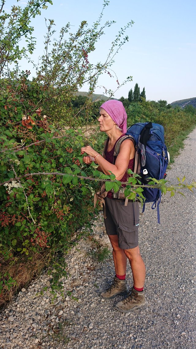 Vandaag vertrekken we als één van de laatste uit de albergue. Lekker relaxed ploffen we neer voor een ontbijt. Koffie met melk en een soort van Berliner bol. Een zoete herinnering uit mijn jeugd.